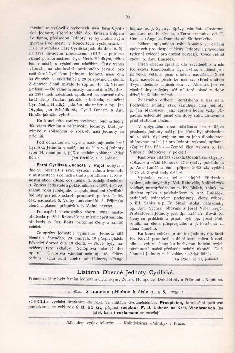 Listárna Obecné Jednoty Cyrillské Ročník: 1898; strana: 64, Přepis ke stažení ve formátu MS Word [0 kB]