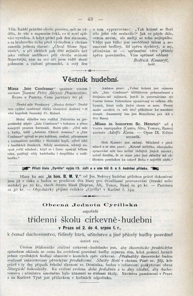 Obecná Jednota Cyrillská uspořádá třídenní školu církevně-hudební Ročník: 1881; strana: 63, Přepis ke stažení ve formátu MS Word [0 kB]