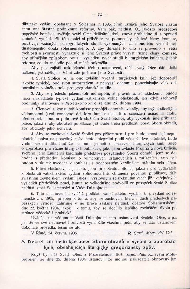 b) Dekret čili instrukce ... o vydání a approbaci knih, obsahuj. liturg. greg. zpěv Ročník: 1905; strana: 72, Přepis ke stažení ve formátu MS Word [0 kB]