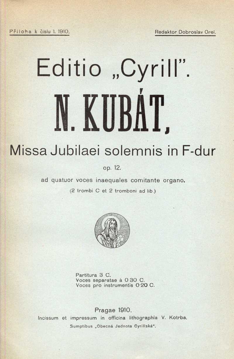 Editio "Cyrill". N. Kubát, Missa Jubilaei (titulní strana) Ročník: 1910; strana: 164, příloha: 1 Přepis ke stažení ve formátu MS Word [0 kB]