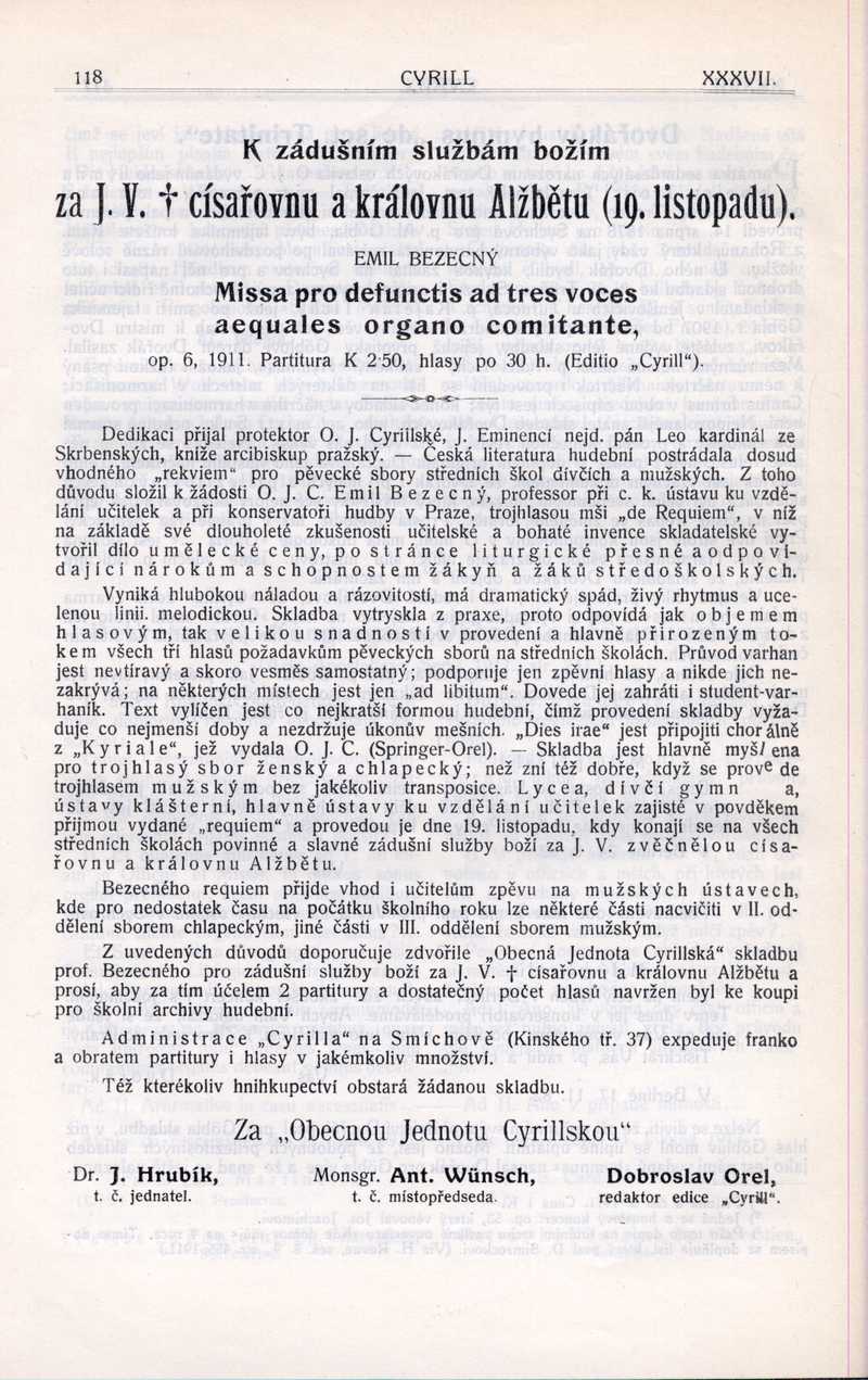 K zádušním službám božím...(Bezecný Emil - Missa pro defunctis...) Ročník: 1911; strana: 118, Přepis ke stažení ve formátu MS Word [0 kB]