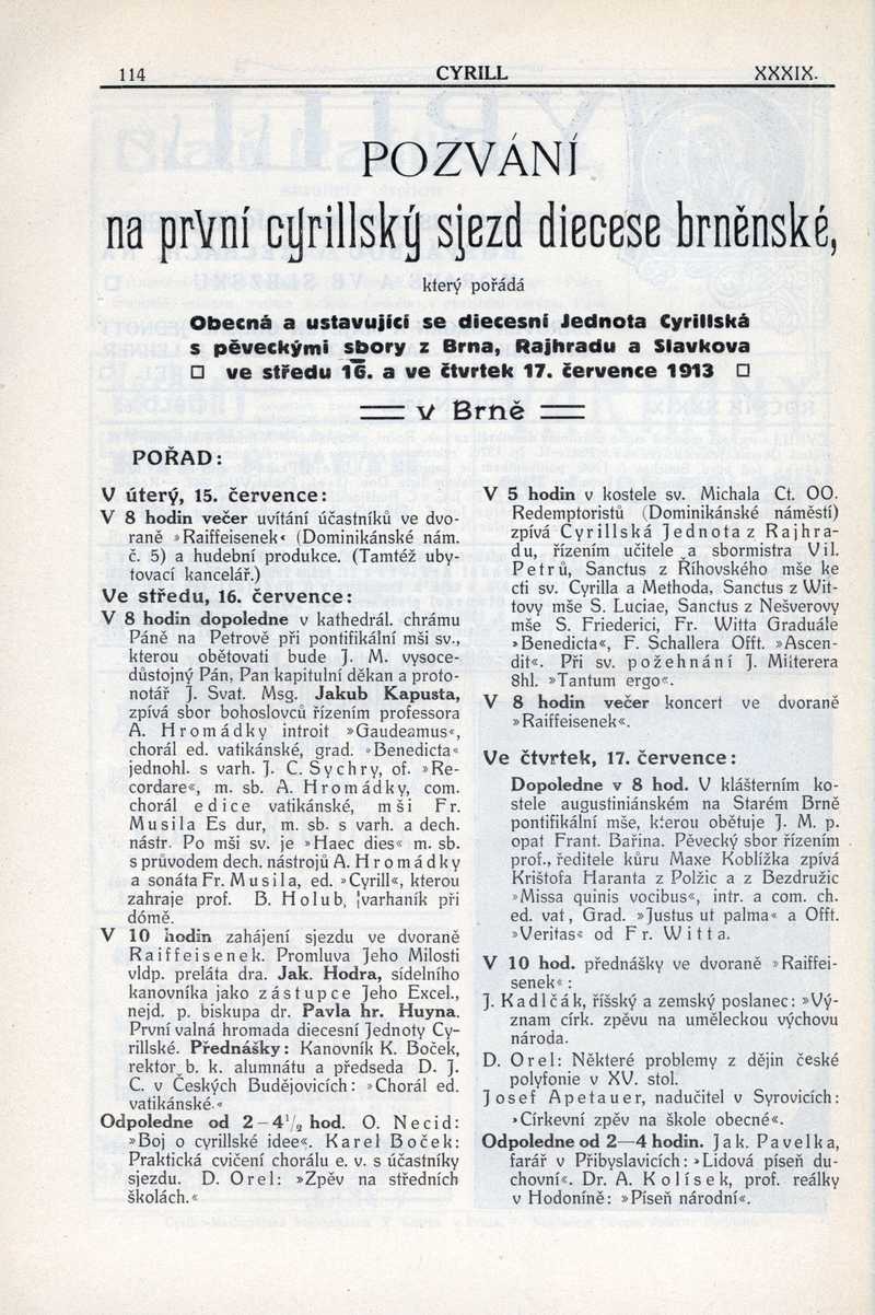 Pozvání na 1. cyrillský sjezd diecese brněnské Ročník: 1913; strana: 114, Přepis ke stažení ve formátu MS Word [0 kB]