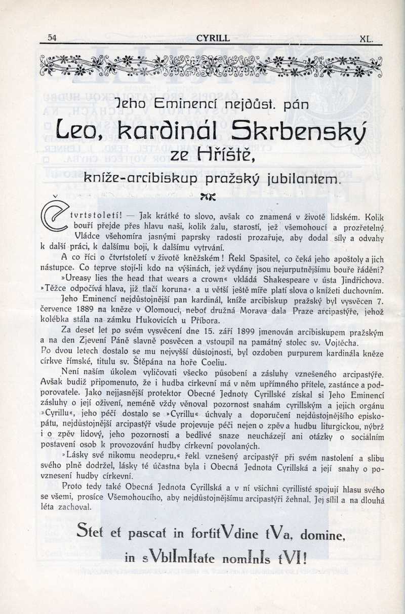 J. E. Leo kardinál Skrbenský ze Hříště, kníže-arcibiskup pražský jubilantem Ročník: 1914; strana: 54, Přepis ke stažení ve formátu MS Word [0 kB]