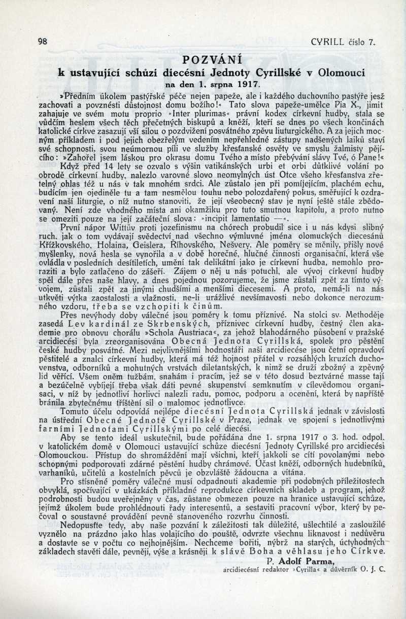 Pozvání k ustavující schůzi diecésní Jednoty Cyrillské v Olomouci Ročník: 1917; strana: 98, Přepis ke stažení ve formátu MS Word [0 kB]