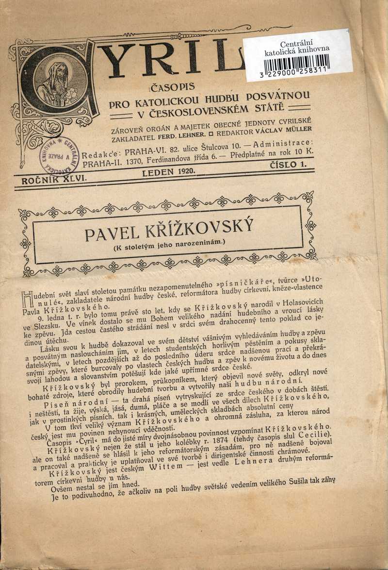 Pavel Křížkovský (K stoletým jeho narozeninám) Ročník: 1920; strana: 1, Přepis ke stažení ve formátu MS Word [0 kB]