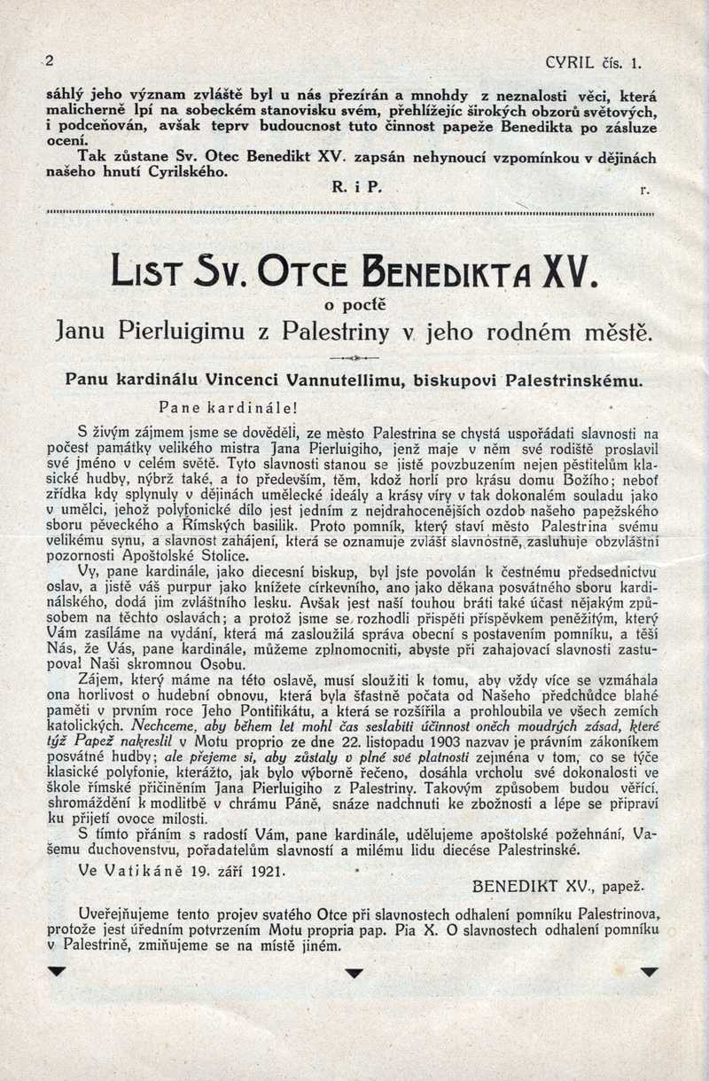 List Sv. Otce Benedikta XV. (o poctě Janu P. z Palestriny) Ročník: 1922; strana: 2, Přepis ke stažení ve formátu MS Word [0 kB]