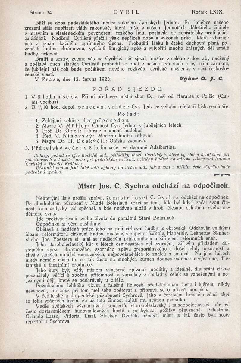 Mistr Jos. C. Sychra odchází na odpočinek Ročník: 1923; strana: 34, Přepis ke stažení ve formátu MS Word [0 kB]