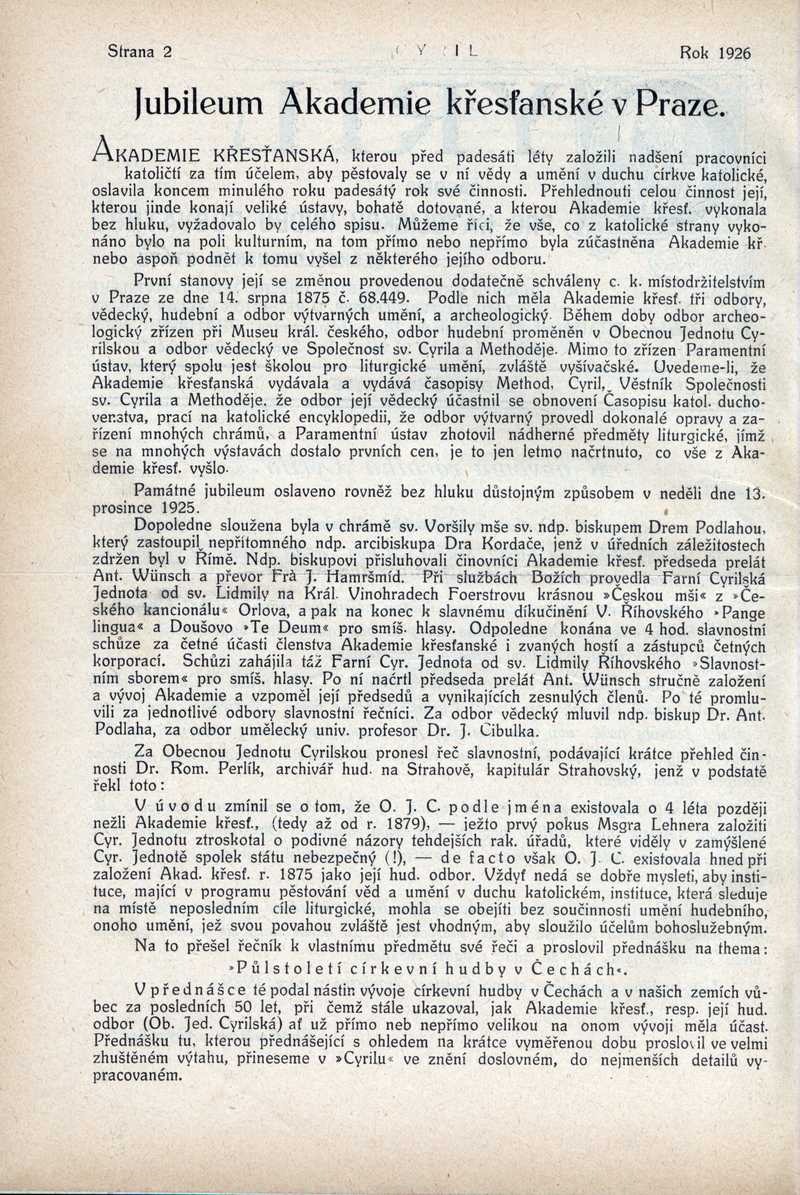 Jubileum Akademie křesťanské v Praze Ročník: 1926; strana: 2, Přepis ke stažení ve formátu MS Word [0 kB]