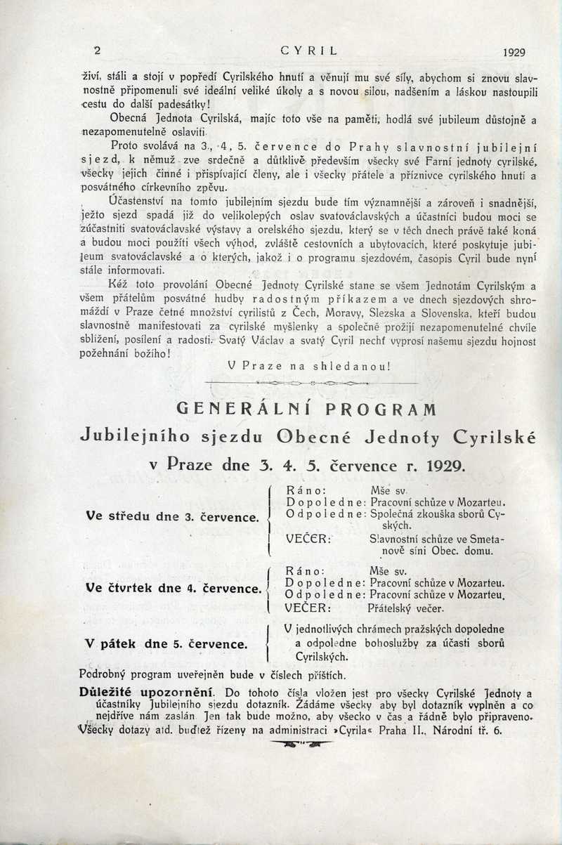 Generální program Jubilej. sjezdu Obec. Jedn. Cyrilské Ročník: 1929; strana: 2, Přepis ke stažení ve formátu MS Word [0 kB]