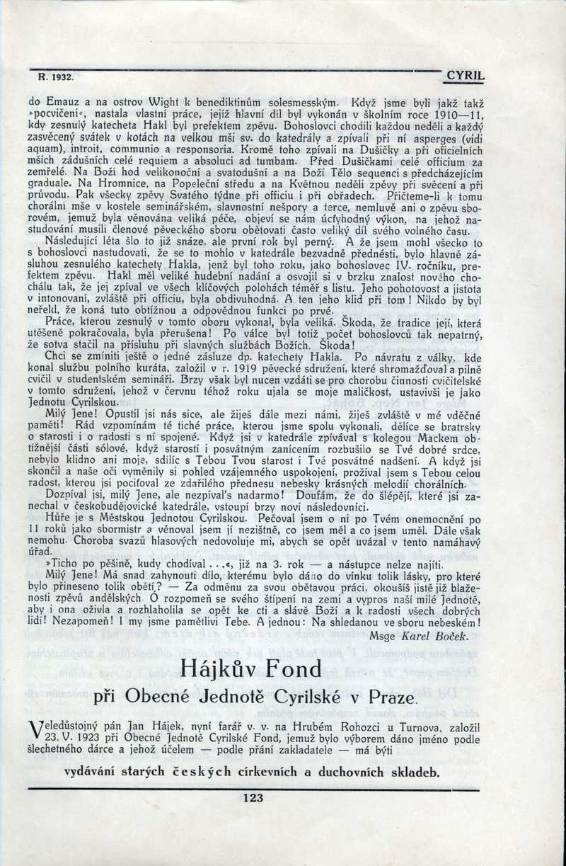 Hájkův Fond při Obecné jednotě Cyrilské v Praze Ročník: 1932; strana: 123, Přepis ke stažení ve formátu MS Word [0 kB]