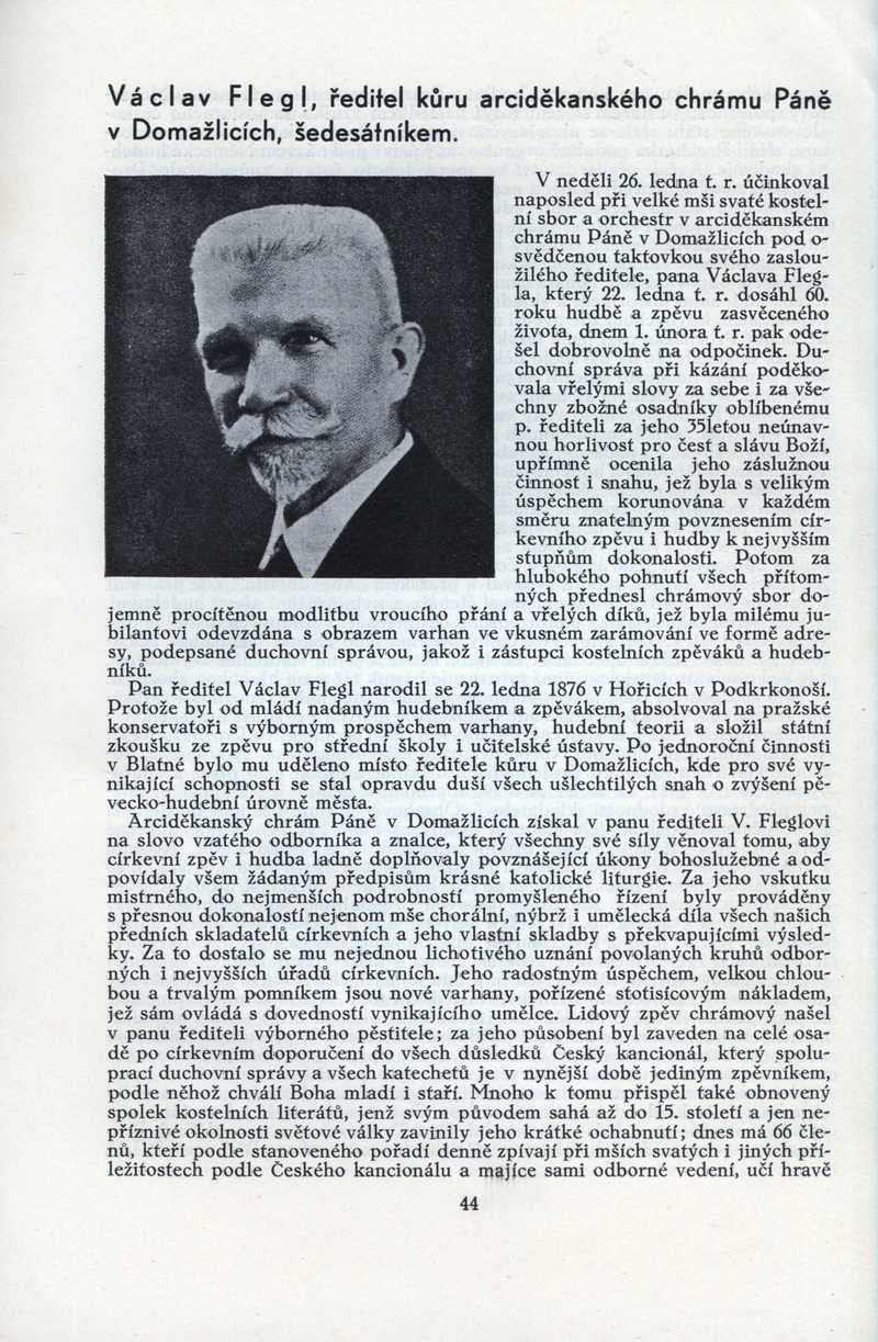 Václav Flegl, ředitel kůru arciděkan. chrámu Páně v Domažlicích, šedesátníkem Ročník: 1936; strana: 44, Přepis ke stažení ve formátu MS Word [0 kB]