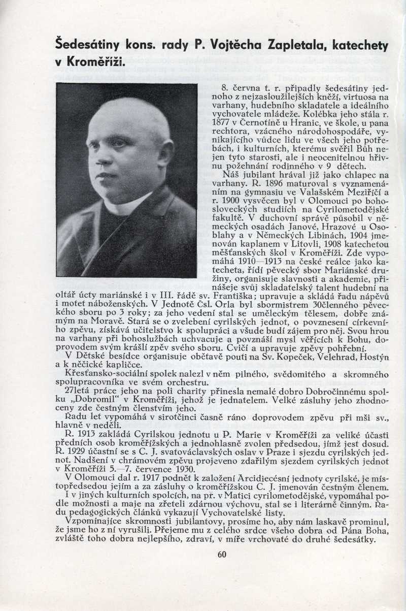 Šedesátiny kons. rady P. V. Zapletala, katechety v Kroměříži Ročník: 1937; strana: 60, Přepis ke stažení ve formátu MS Word [0 kB]