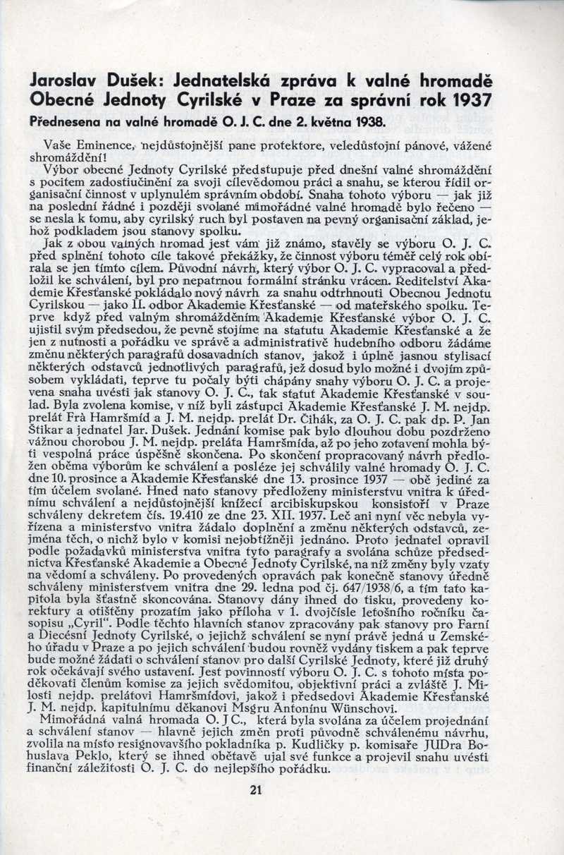 Jednatelská zpráva k valné hromadě Ob. Jednoty Cyrilské za správní rok 1937 Ročník: 1938; strana: 21, Přepis ke stažení ve formátu MS Word [0 kB]