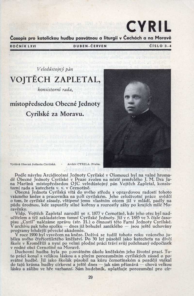 Veledůst. pán Vojtěch Zapletal místopředsedou O. J. C. za Moravu Ročník: 1940; strana: 29, Přepis ke stažení ve formátu MS Word [0 kB]