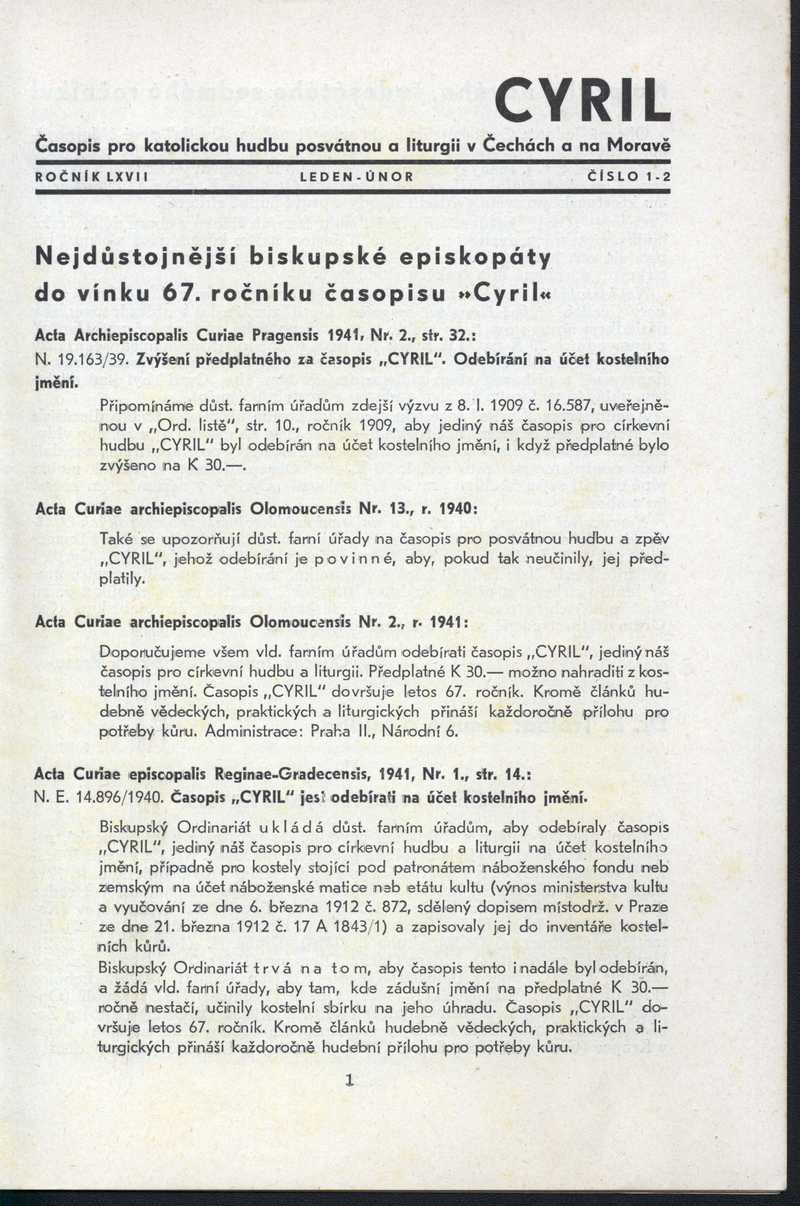 Nejdůstojnější biskupské episkopáty do vínku 67. roč. časopisu "Cyril" Ročník: 1941; strana: 1, Přepis ke stažení ve formátu MS Word [0 kB]