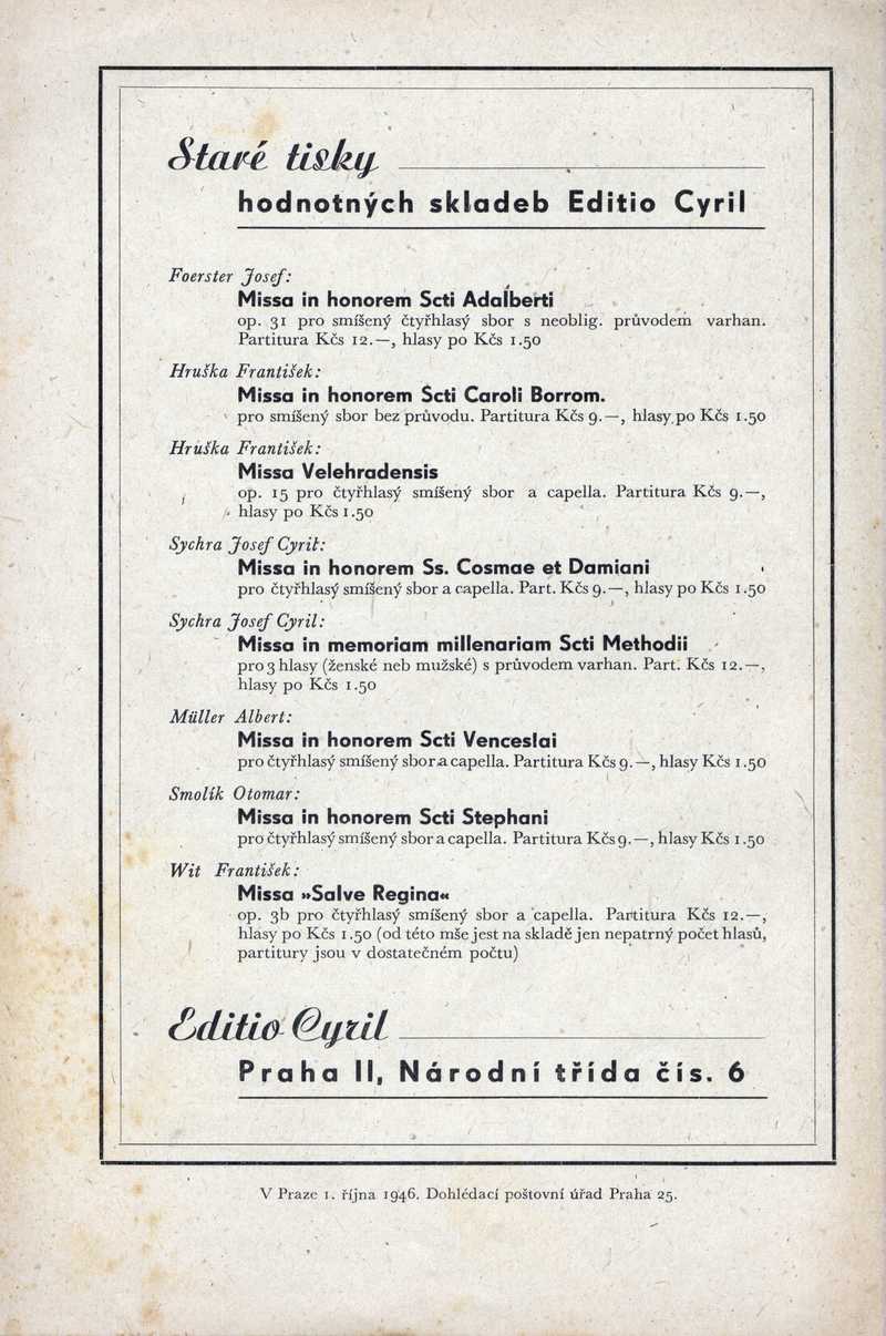 Staré tisky hodnotných skladeb Editio Cyril Ročník: 1946; strana: 96, příloha: 2 Přepis ke stažení ve formátu MS Word [0 kB]